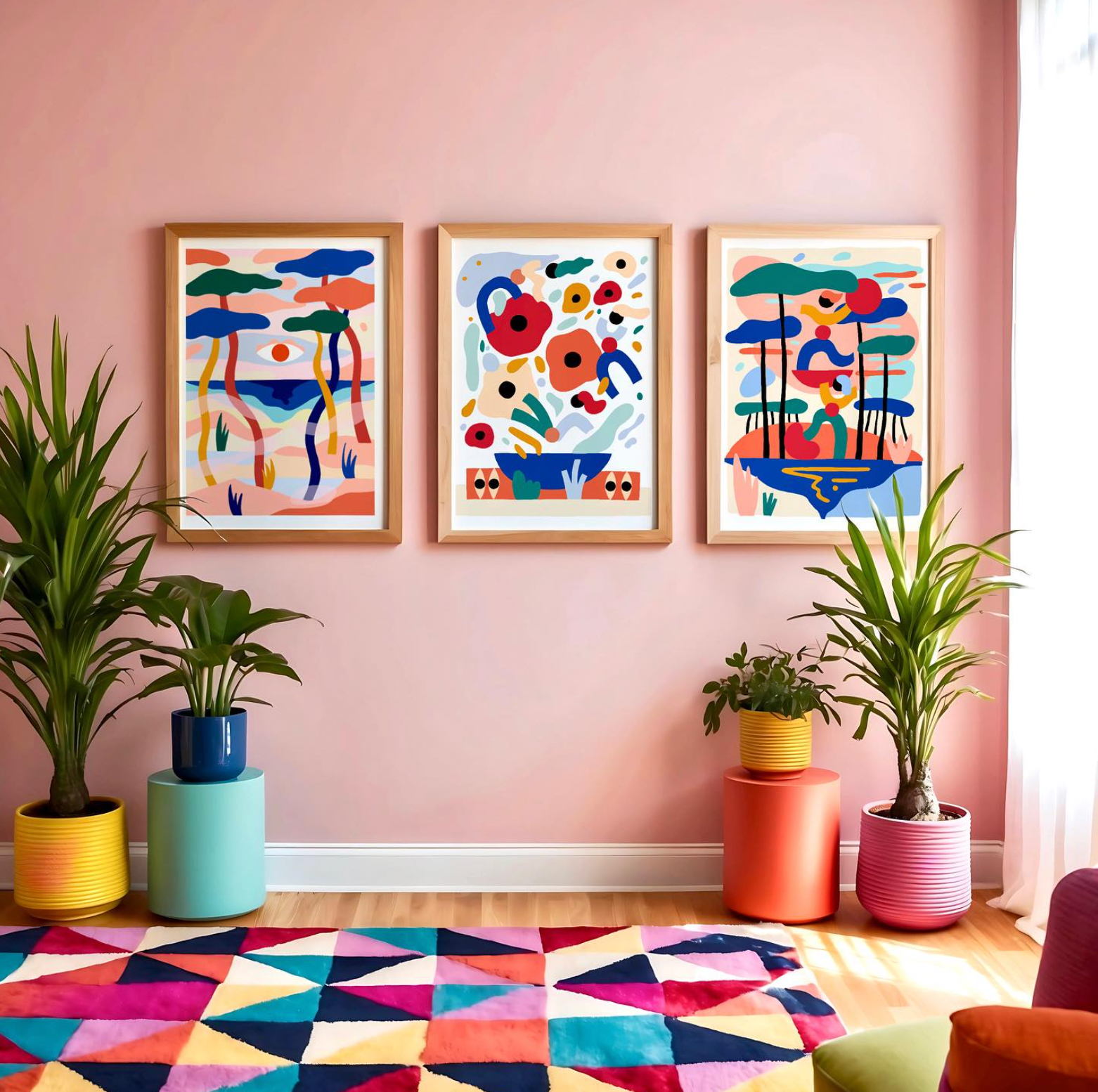 Je défends un art coloré, graphique, et apaisant. Les couleurs et les contrastes sont au centre de mes œuvres. Je combine aplats et formes simples pour créer un visuel onirique et poétique.